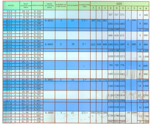 The second group: used to indicate the specifications of the radiator. The front number indicates the decimeter number of the length and width of the normal section of the radiator under ventilation (the two numbers are separated by "×"). The type is represented by phonetic alphabet.