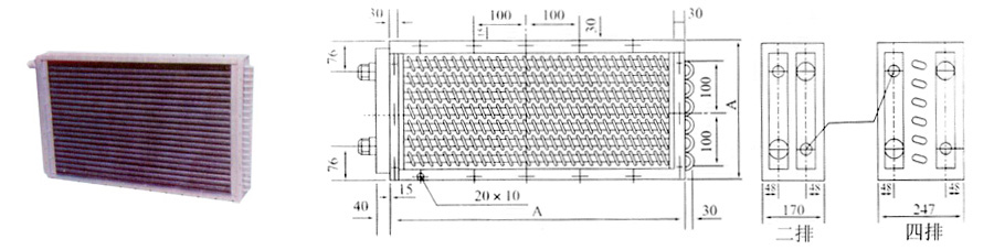 GL II型為鋼制雙回路(二排)或多回路(四排)的空氣熱交換揣。翅片管用φ18×2mm無縫鋼管繞制上10×0.3mm鋼帶而成,呈螺絲旋狀,可有各種表面管數,管長排數組成多種規格,進出水管位于同一側,工質熱源為蒸汽或高溫水,冷源為低溫水或鹽水,可用作空氣加熱器或空氣冷卻器,是一種經濟耐用通用散熱器。 GLⅡ型編號方法為: 型號—排數—表面管數—表面管長(英寸)如采用四排,表面管數為10,管長為42英寸時,則為GL II—4—10—42