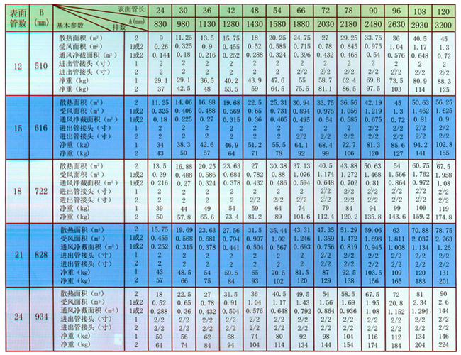 翅片管均用φ416×lmm紫銅管紅制上10×0.2mm的皺折紫銅帶而成,呈螺旋狀,具有3.2mm-"R",4.2mm-"M",6.5mm-"T"三種不同的片距,"R"種片別具匠心,片距小而散熱面積大具有大的散熱量,"M"種片距,片距較大,散熱量及空氣阻力均較小,"T"種片距,片距大,經(jīng)久耐用,安裝方便,經(jīng)濟(jì)合算。